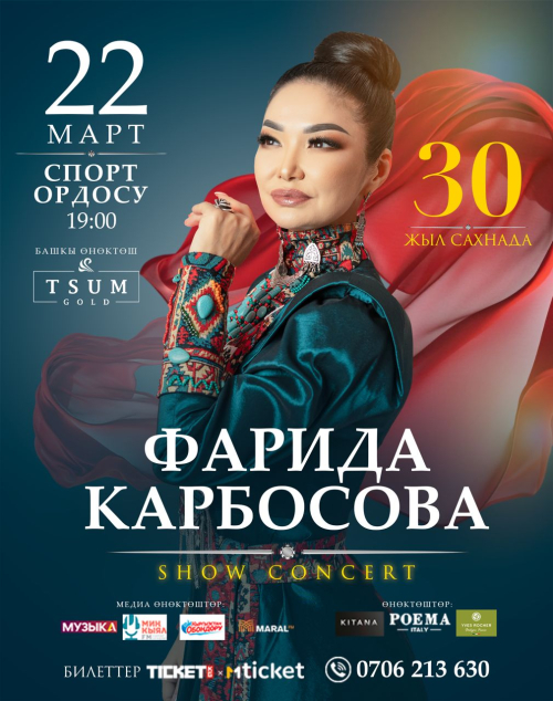 Кыргыз элинин сүйүктүү ырчысы Фарида Карбосова сахнадагы 30 жылдык чыгармачылык жолун белгилеп, чоң шоу-концертин тартуулайт!