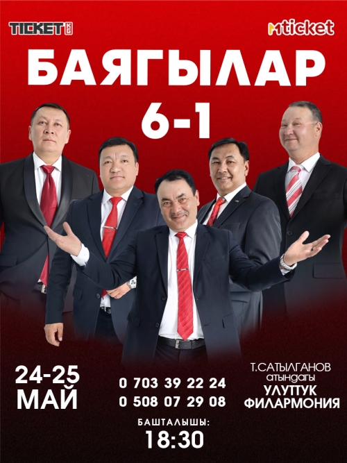 24-25-май күнү саат 18:30да Токтогул Сатылганов атындагы Кыргыз улуттук филармонияда "БАЯГЫЛАР" тобунун "АЛТЫ МИНУС БИР" атту чоң концерт өтөт.