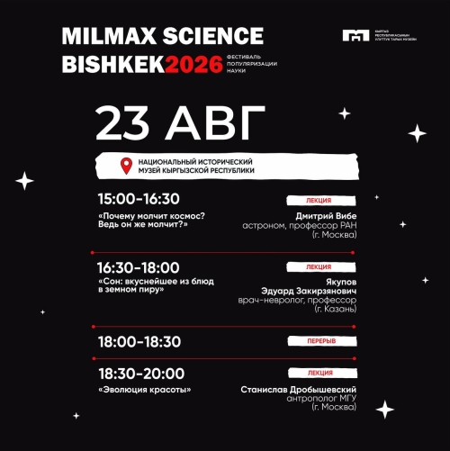23 августа в Национальном историческом музее Кыргызской Республики вас ждёт ещё один насыщенный день фестиваля MILMAX SCIENCE BISHKEK 2026 — день, наполненный яркими лекциями, научными открытиями и увлекательными темами, которые заставят по-новому взглянуть на человека, космос и саму природу красоты.